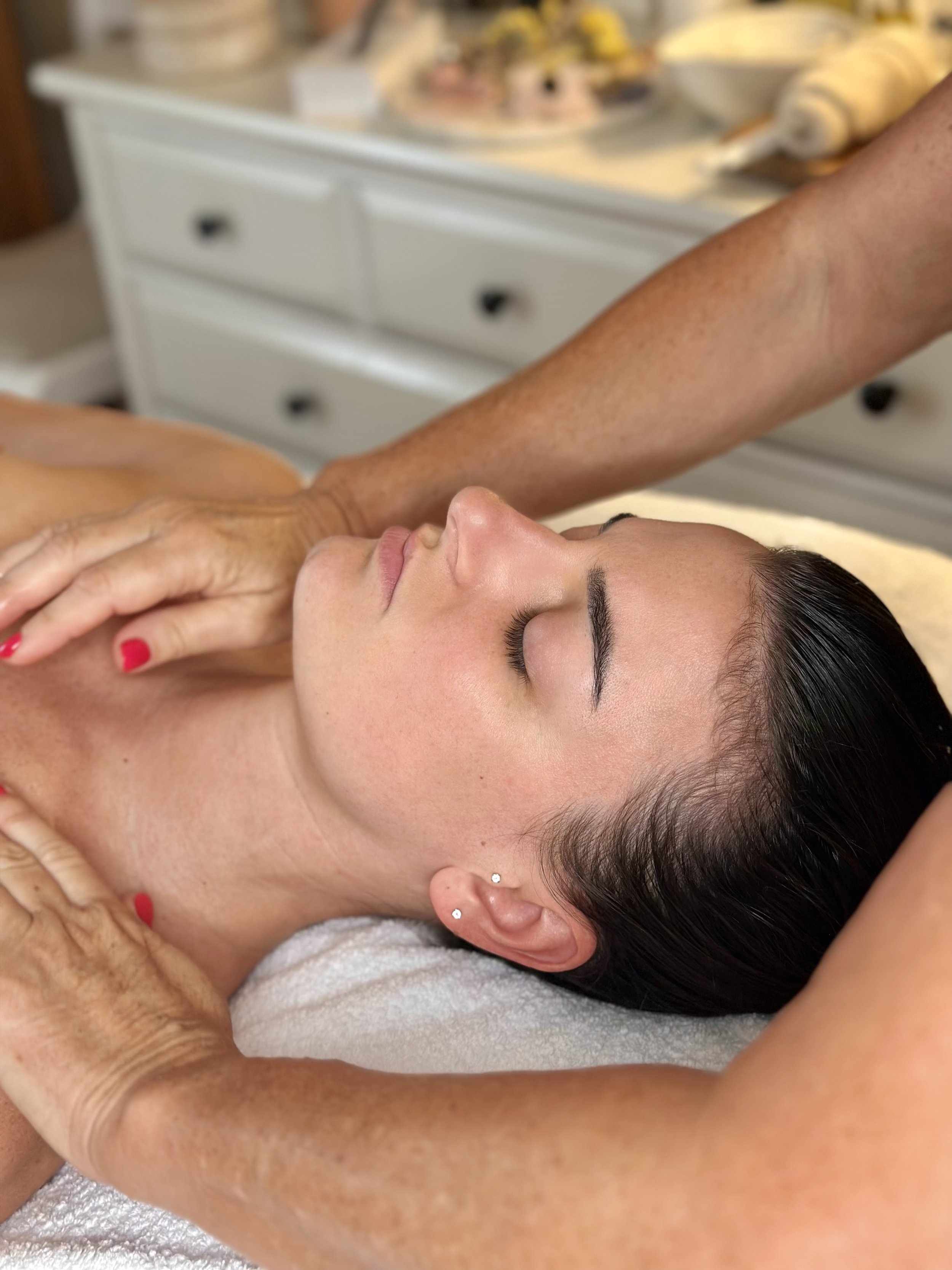 Le toucher grâce à mes mains qui effectuent un ballet sur le décolleté, cou nuque et crane...